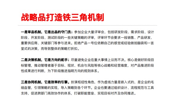 一款战略品的成功,离不开企业内部强大的系统机制保障。文档中提到了支撑战略品打造的“铁三角机制”:审品机制作为“守门员”,杜绝凭感觉决策,确保产品与战略对齐;决策机制作为“舵手”,明确阶段目标,推动高效决断;协同机制作为“引擎”,打破部门墙,确保策略在研发、生产、营销等各环节无缝落地。这种系统化的组织能力,是产品创新能够持续转化为市场优势的内在基础。