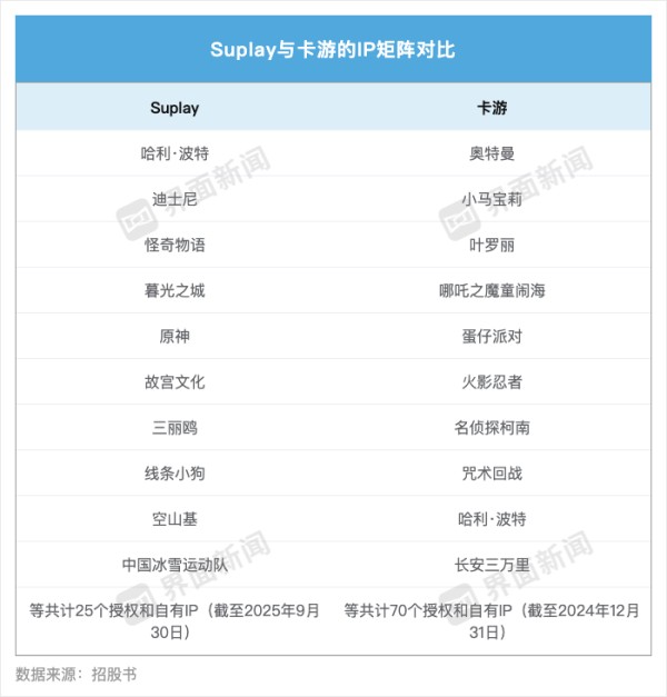 Suplay和卡游营收对比 图表制作:界面新闻 马越 与泡泡玛特主要依靠自有IP不同,Suplay和卡游都是依赖于授权IP,但这两家公司的IP矩阵有所不同。