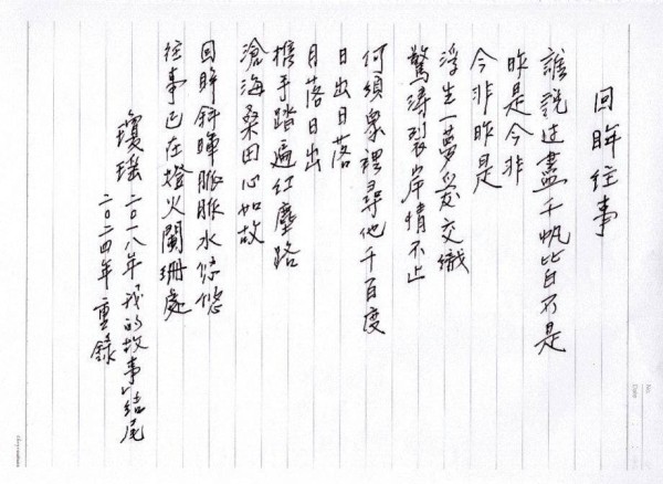 谁说过尽千帆皆不是,昨是今非,今非昨是,浮生一梦爱交织,惊涛裂岸情不止。何须众里寻他千百度,日出日落,日落日出,携手踏遍红尘路,沧海桑田心如故。回眸斜晖脉脉水悠悠,往事已在灯火阑珊处。