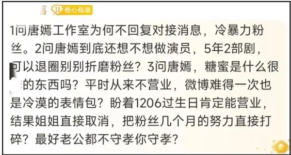 有粉丝在评论区留下长篇留言,三问唐嫣及其工作室,其中第二问尤其刺耳:“唐嫣,你到底还想不想做演员了?五年只播了两部剧,不如退圈别折磨粉丝了。”