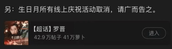 同时,罗晋11月30日的生日也取消了庆祝活动。对于粉丝来说,过度庆祝明星私人事务显得不够体谅。