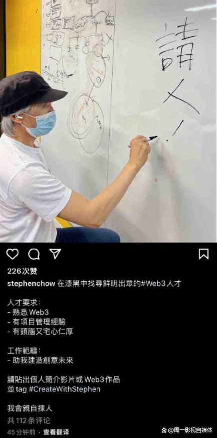 周星驰开通个人社交账号后,随即发出了“江湖召集令”,他要招募web3人才,为互联网的未来布局!