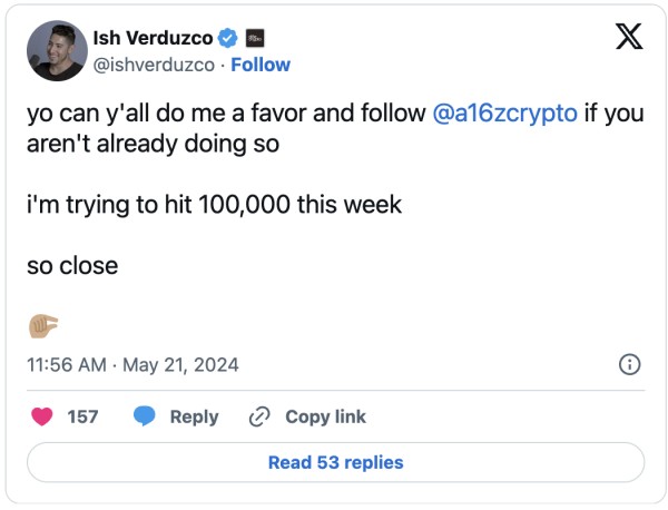 你可以查看我们账号 @a16zcrypto 的点赞和回复。我们可以清楚地看到,这个账号有数千乃至上万次的互动。