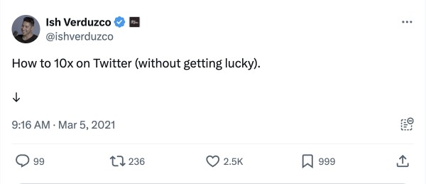 我相信,如果你能够在特定领域为他人提供帮助,那么在很长一段时间内,人们都会将你视为第一选择。这会让人们更愿意关注、参与和分享你的内容(这能使你的内容得以进入更多层级的传播网络)。你也可以借助内容来供人们娱乐消遣或者获得激励,但都应该建立在帮助人们解决特定问题的基础上。至于策略,具体细节如下(在 X/Twitter 上):
