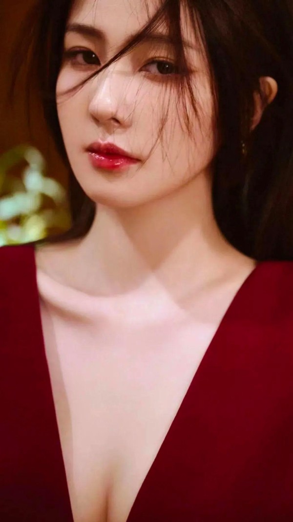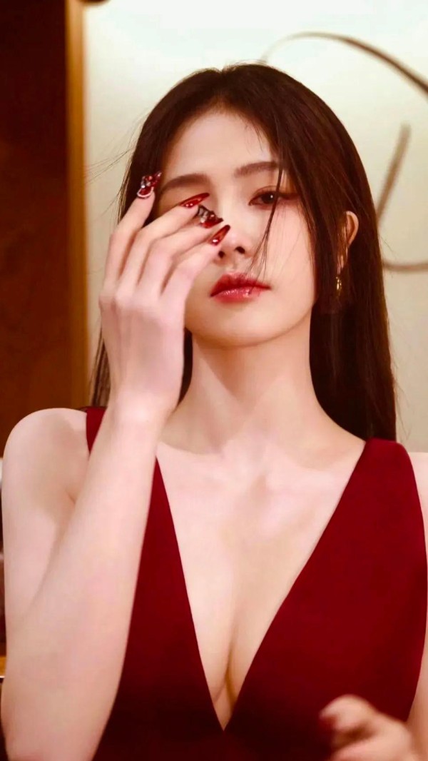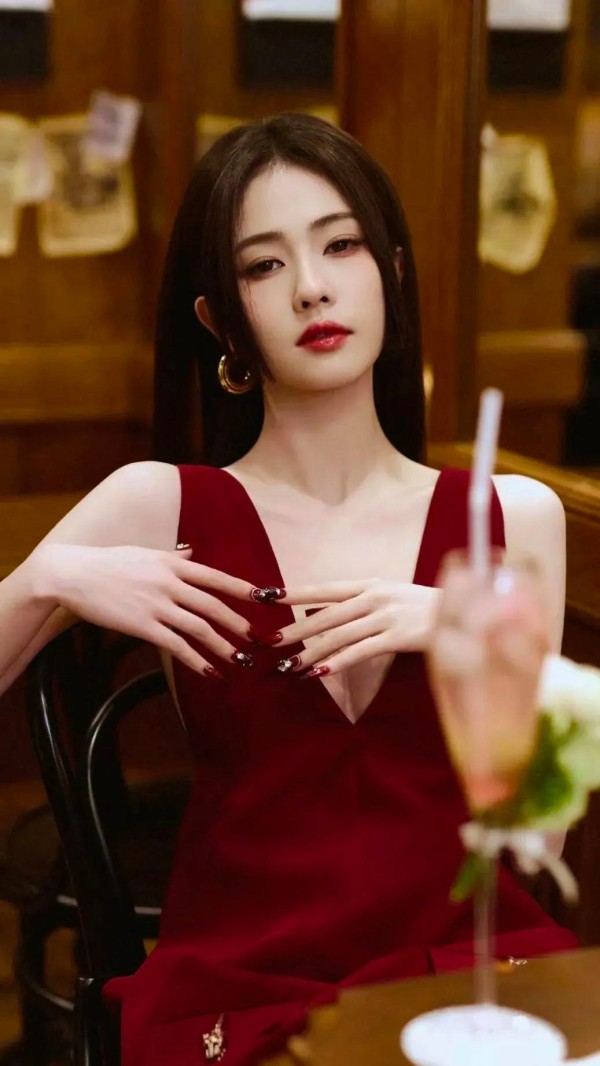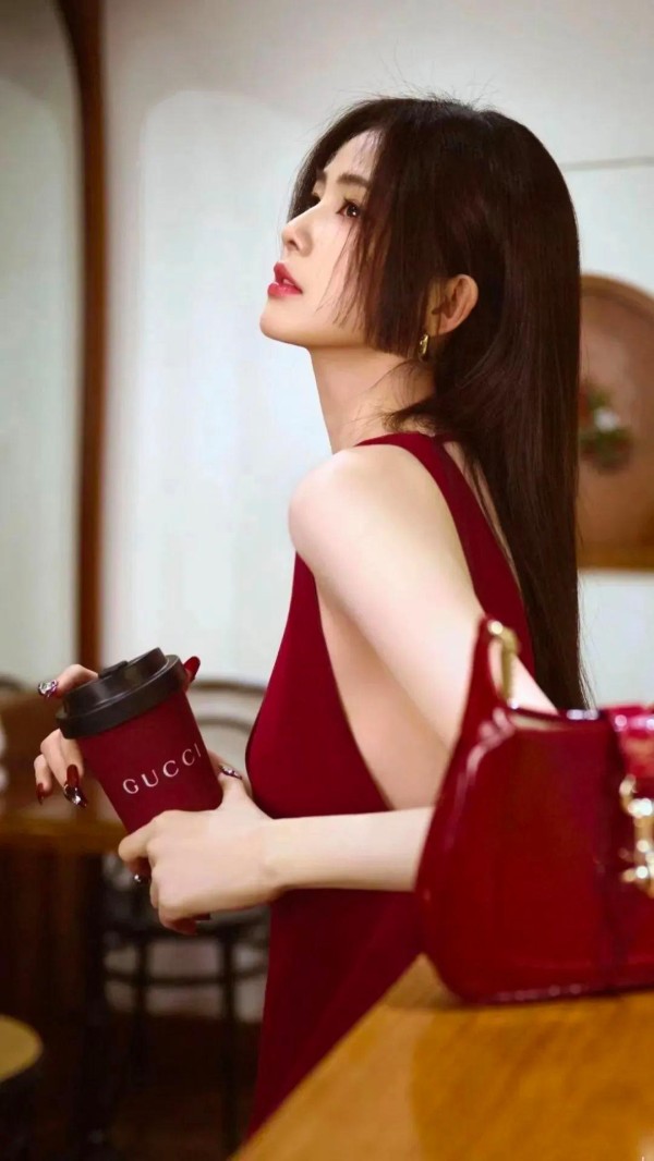 照片中,她身穿红色连衣裙,完美勾勒出身材曲线,同时深V设计拉长颈部线条,显得更加修长。