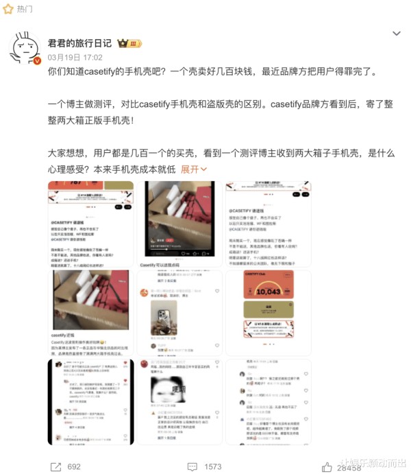 令人意想不到的是,被誉为手机壳界“爱马仕”的CASETiFY,竟因一位测评博主而被消费者以“背刺”的名义骂上热搜。博主@零志零前不久发布了一则测评视频,将原版CASETiFY手机壳与价格在7元、20元、30元的盗版手机壳进行了对比。虽然博主总结道,“原版在工艺和细节上略胜一筹”,但对于“500元是否值得”的问题,她依然持怀疑态度,最终竟推荐了那些低价盗版,理由是“外观上差别不大”。