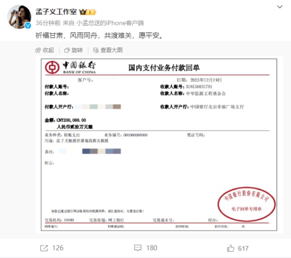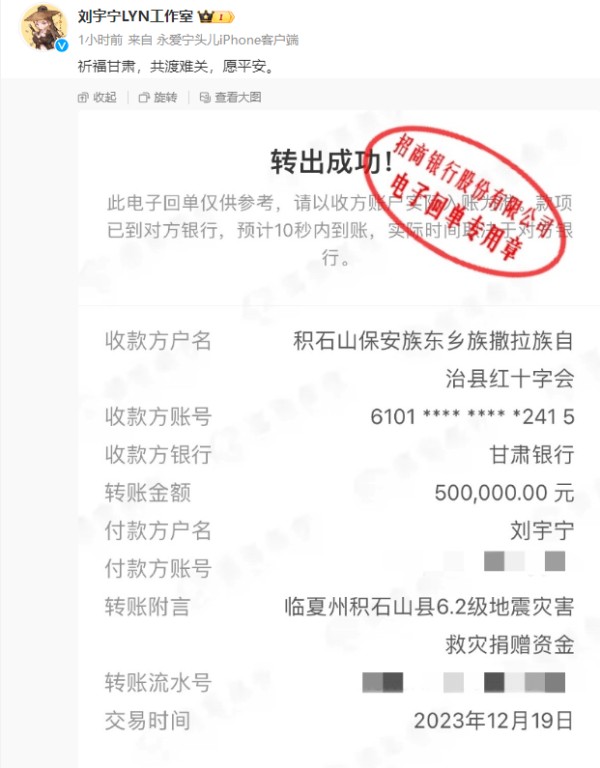 刘宇宁工作室官微晒出转账截图,表示已经向甘肃灾区捐赠50万元救灾资金。