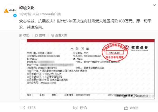 峰骏文化官微消息,时代少年团决定向甘肃受灾地区捐款100万元。
