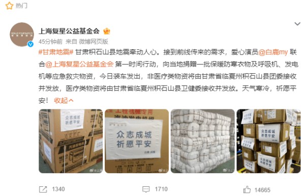 风雨同舟,祈福甘肃!还有更多的明星艺人正在加入到驰援甘肃、青海地震灾区的队伍中来,愿大家一起众志成城、共暖寒冬。