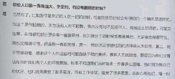 3.范冰冰首谈与李晨分手:他因为我受了很多牵连 近日,范冰冰在接受采访时首次提到和李晨分手一事,她表示对方是一个值得自己尊敬的人,也是值得付出的人:“感谢他在这段时间里给予我的美好,当时因为我自己的状况,他和我弟弟受了很多牵连,所有工作停摆。遭受了很多委屈,我很心疼他们。我唯一能做的就是让他们远离我,让我尽量不要再影响他们。