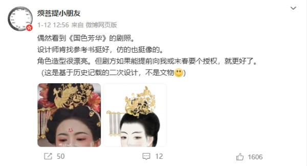 1月12日,《中国妆束,大唐女儿行》作者左丘萌发文称:“《国色芳华》这样直接照搬我的书不应该。”其还配上了《国色芳华》剧照与其所著《中国妆束:大唐女儿行》中所呈现的妆容图片进行对比。