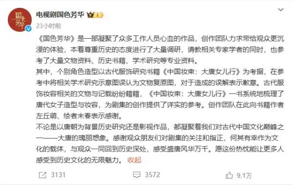 《国色芳华》剧方道歉!因妆造被指抄袭引发热议