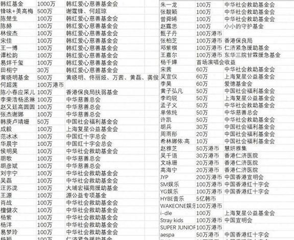韩国那四大娱乐公司,JYP捐了200万港币(约182万人民币),SM娱乐100万港币,YG娱乐100万港币,HYBE捐了5亿韩币(约241万人民币)。