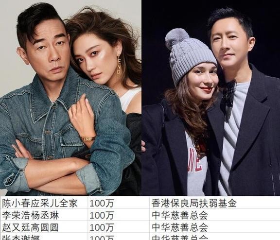 你看陈小春和应采儿、李荣浩和杨丞琳、赵又廷和高圆圆、张杰和谢娜,这四对夫妻,每对都捐了100万。