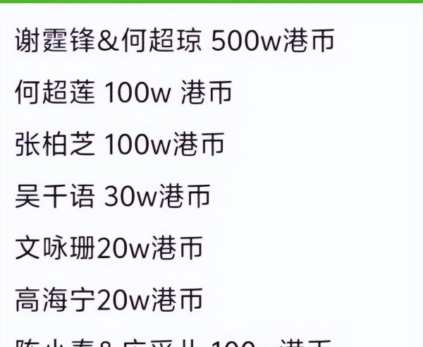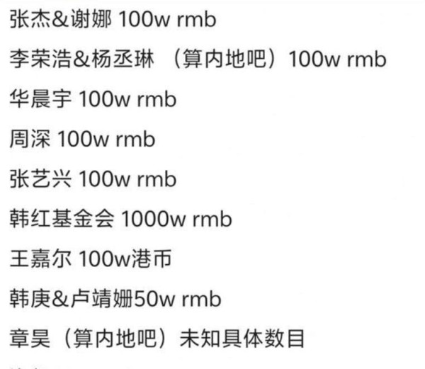 胡歌、李荣浩夫妇、王嘉尔、张智霖夫妇、陈小春夫妇都各自出了一百万。
