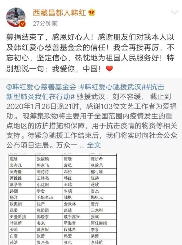 明星捐款支援武汉,韩红公布53位明星捐款名单!