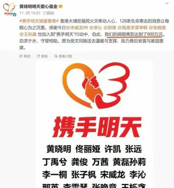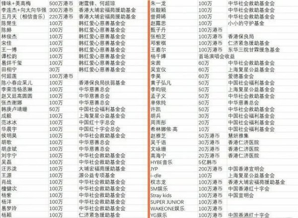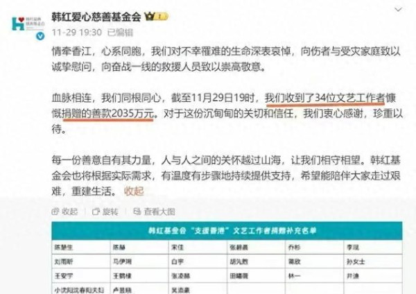 这次捐赠集中在几个老牌基金会。韩红爱心慈善基金会最广,34位艺人通过该通道捐出约2035万元,很多人以百万为单位;黄晓明的明天爱心基金集合了17位艺人,共捐800万元;香港本地艺人也不示弱,张柏芝、陈小春、张智霖、邓紫棋、甄子丹等以港币计款,梁朝伟、刘嘉玲夫妇捐出200万港元。韩流方面,权志龙在港参加MAMA时也捐了100万港币,且指定用于消防员心理支持,显示出从物资到心理援助的思路在慢慢成形。马伊琍、李现、刘雨昕、张碧晨等以100万元起步的“百万档”捐款,已经成了圈内常见的表达方式。