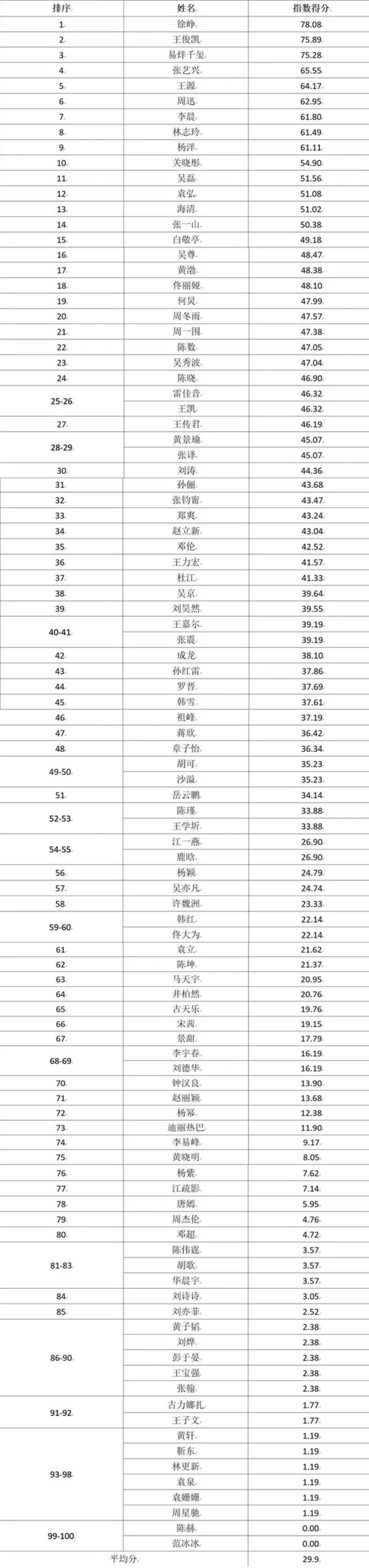 前十位明星的具体评价数据为:徐峥(78.08分)、王俊凯(75.89分)、易烊千玺(75.28分)、张艺兴(65.55分)、王源(64.17分)、周迅(62.95分)、李晨(61.80分)、林志玲(61.49分)、杨洋(61.11分)、关晓彤(54.90分)。