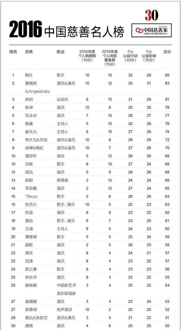 近日,《中国慈善家》杂志举办的一年一度中国慈善名人榜正式揭晓。在“2016中国慈善名人榜”上,韩红以卓越的公益表现荣登榜首,黄晓明&Angelababy夫妇以及知名篮球运动员姚明紧随其后。同时,因演技出众而备受瞩目的胡歌、微胖界代表蒋欣、总攻范儿十足的刘涛,以及TFboys、鹿晗、张艺兴等一众“小鲜肉”也纷纷入榜,他们为公益事业注入了新的活力。