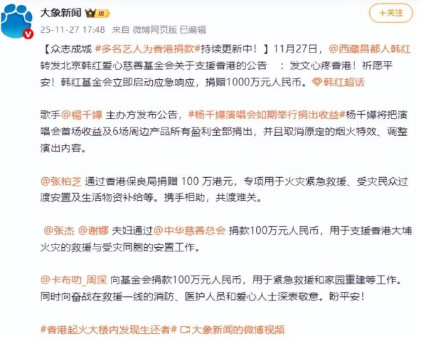 当香港新界大埔的烈焰尚未完全熄灭,当受灾同胞仍在困境中坚守,五束温暖的星光穿透阴霾,以真金白银的善举诠释着“同胞一心”的重量。韩红、张杰谢娜夫妇、周深、张柏芝,他们用不菲捐款与赤诚之心,为“偶像”二字写下最动人的注解——这才是我们该追的星。