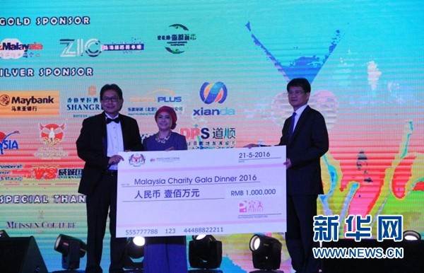 完美公司向慈善晚宴捐赠100万人民币(左一为马来西亚驻华大使,左二为大使夫人)。图片由马来西亚驻华大使馆提供