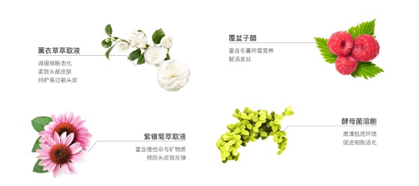 内含薰衣草萃取液、紫锥菊萃取液、覆盆子醋与酵母菌溶胞,起到预防头皮屑反弹、减缓细胞老化、紧致头部皮肤、呵护易过敏头皮的效果。弱酸性的特点,使得它在清洗头皮的时候十分温和,对于头皮敏感人士非常友好。