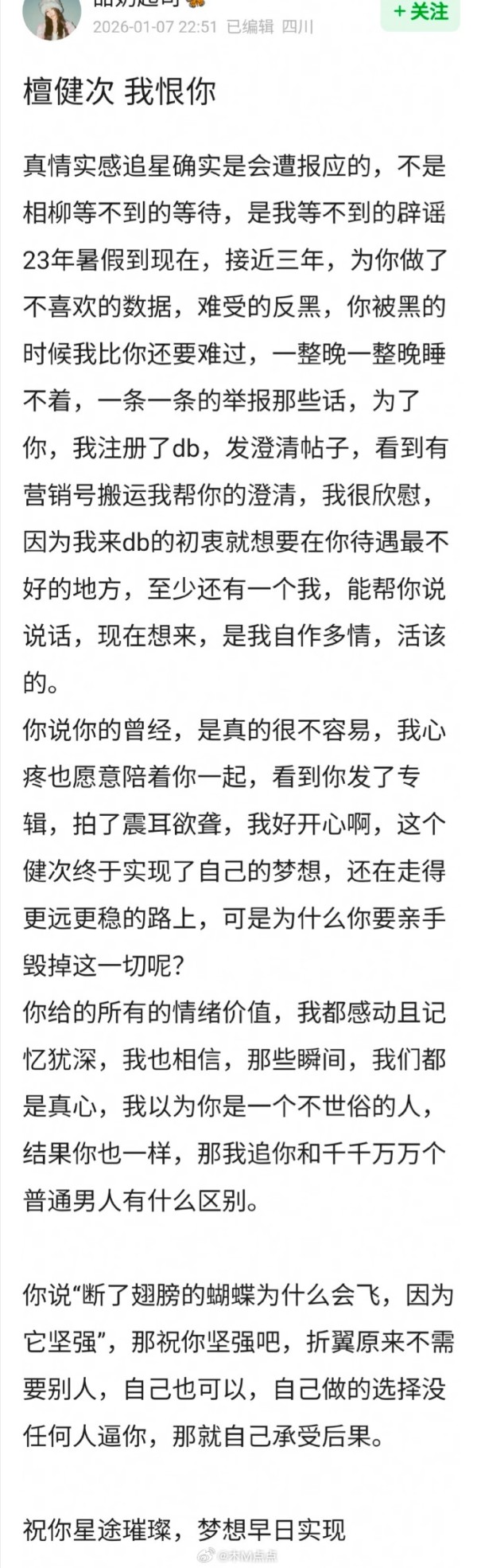 #檀健次粉丝现状# 檀健次脱粉贴,看起来是爱过的…