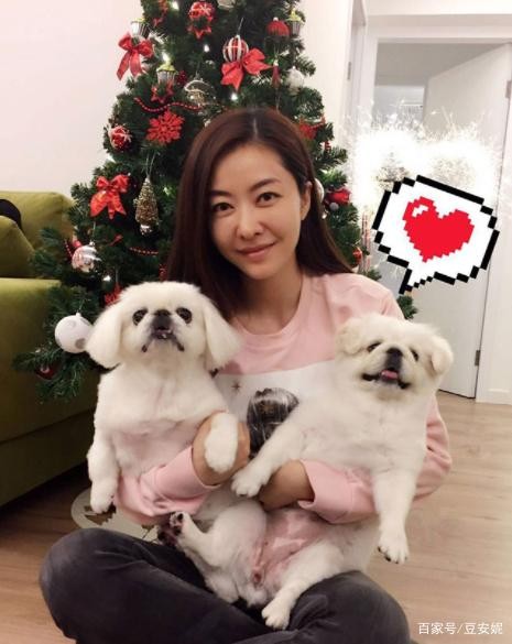 室内一角熊黛林穿着居家服左拥右抱两只爱狗盘坐在地板上,身后是一颗挂着很多闪亮装饰品的圣诞树。照片中可以看到室内以白色为主装修,风格简约大方,白墙和白色的门让屋内看起来更宽敞明亮。圣诞树旁边则购置了一张黄绿色沙发,颜色特备的沙发并不显突兀,画面温馨很有生活气息。