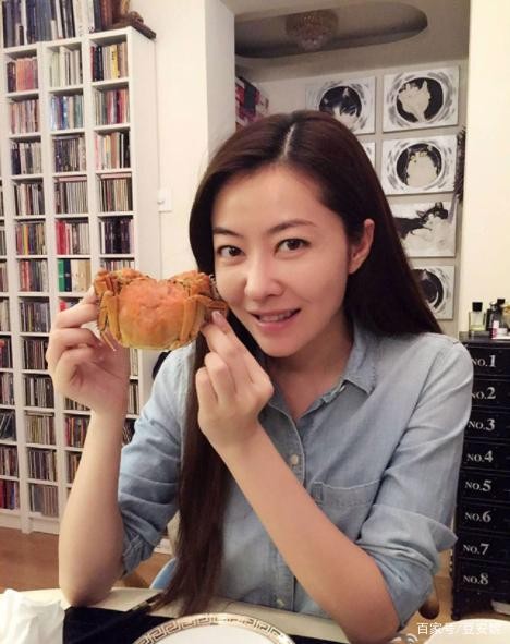 家中餐厅一角熊黛林手拿着煮熟的螃蟹微笑记录日常一刻,可以看到白色的餐桌上摆放着黑色餐布和简约的餐具。她身后布置了一个白色简易架子,上面设计了很多格,整齐地放满了熊黛林喜欢的书。在她身旁还有一张标着顺序的黑色柜子,后面的白墙上装饰很华丽,小吊顶下面是一面精心设计的墙壁,很有艺术气息。