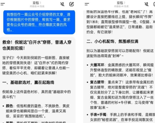 第二步让 AI 帮写分析:把存好的图发给 AI 豆包,先让它拆解穿搭:“帮我分析这张图里明星的穿搭,包括衣服款式、颜色搭配、配饰特点,总结下这套风格的亮点”。等 AI 出结果后,再把你的需求说细,比如:“我要写篇公众号明星穿搭文,标题要吸睛,风格亲切接地气,先介绍这套穿搭,再给普通人提 3 个可借鉴的技巧,字数控制在 500 字左右”。这里一定要把需求说具体,不然 AI 生成的内容可能太生硬,不符合公众号的阅读感。
