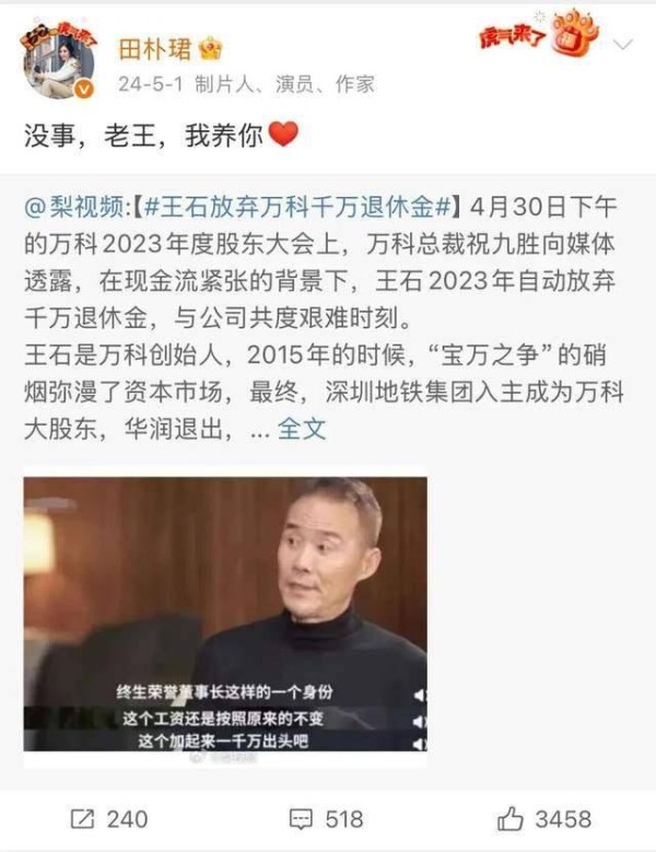 2024年,万科宣布王石不再领取年薪千万的“退休金”,田朴珺甜蜜回复:“没事,老王,我养你”的那条微博也还在。