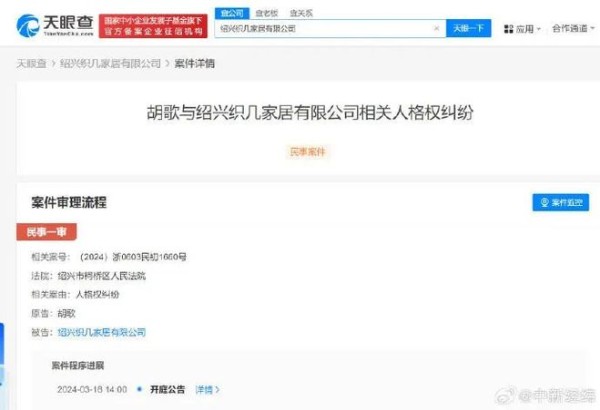 天眼查法律诉讼信息显示,近日,胡歌与绍兴织几家居有限公司相关人格权纠纷案件新增开庭公告,原告为胡歌,该案将于3月18日在绍兴市柯桥区人民法院开庭审理。