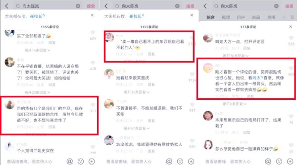 有网友评论道:“观看向太的直播,仿佛目睹了一出富人抛出诱饵,然后讥讽地看着一群饿狼争抢的戏码。”或许是因为网友的言论过于尖锐,向太在直播首秀后的次日便关闭了视频评论功能。