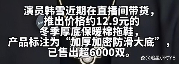 11月18日,韩雪开启直播带货模式,这一操作直接在网络上炸开了锅。在大家的固有印象里,韩雪就像娱乐圈里的一股清流,气质清冷,仿佛不食人间烟火。可这次直播,她完全颠覆了大众的认知。直播间里,她上架的商品不再是那些昂贵的奢侈品或者高端护肤品,而是10余元的雪地棉拖鞋等平价好物。这巨大的反差,就像一道闪电,瞬间吸引了无数网友的目光。第三方数据更是让人惊掉下巴,近30天韩雪直播带货总销售额约2500万元至5000万元。