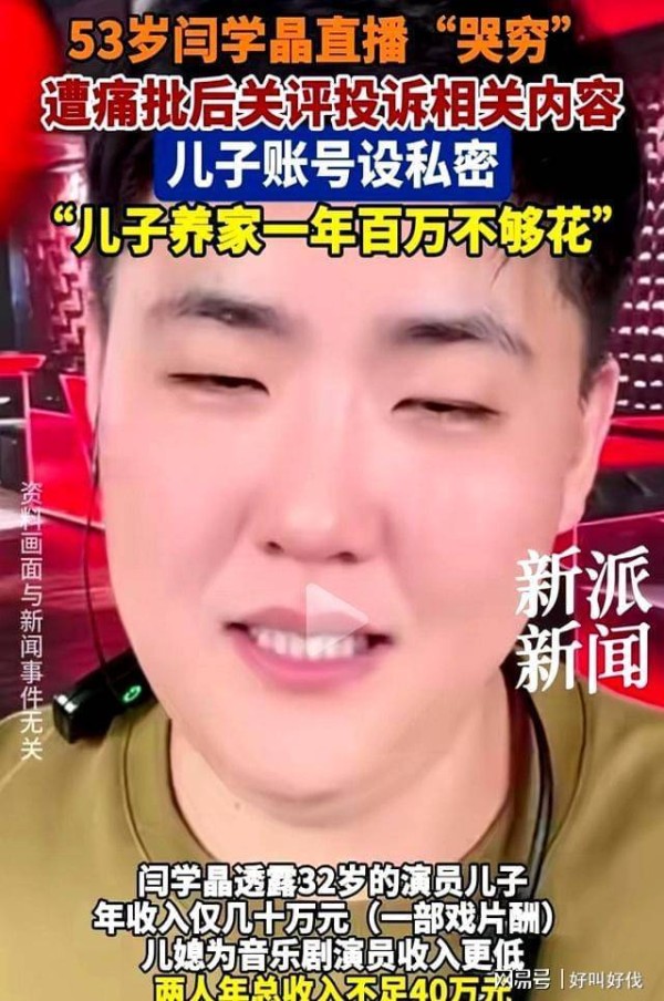 闫学晶回应直播哭穷争议演员闫学晶哭穷引争议!儿子年收入不到40万养家压力大闫学晶哭穷翻车,却意外捧红韩红!网友:一天一地,这才是真明星闫学晶哭穷翻车:一顿11个菜,客厅能打球,儿子也被她坑惨了闫学晶直播哭穷引争议,称儿子年收入不到40万,无法承担百八十万开销娇娇怒撕闫学晶!句句扎心,明星哭穷的遮羞布被撕得稀碎闫学晶哭穷,却被扒带着7万手表,一件衣服过万,这叫穷人?闫学晶直播哭穷引热议 称儿子年收入几十万不够家庭开支片酬几十万却哭穷!闫学晶狂怼网友引众怒,代言的大酱损失惨重闫学晶直播自爆儿子养家压力大,拍一部戏才赚几十万