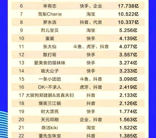紧随其后,papi酱、辛巴、雪梨和罗永浩分别位列第五至第八名,他们的总收入也均超过了10亿,这一收入水平甚至超越了许多一线明星。