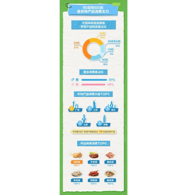 - 消费性别比例:男性消费者占比51%,女性消费者占比49%,表明男女消费者对农特产品的需求较为均衡。