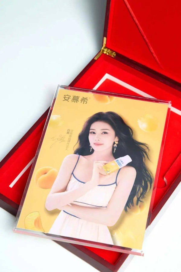 今年8月,安慕希围绕着品牌代言人白鹿推出了一次常规的物码营销活动,用户在活动期内购买指定包装产品、开箱扫码参与抽奖,就有机会抽中一款约 10 克足金制成的白鹿黄金海报。