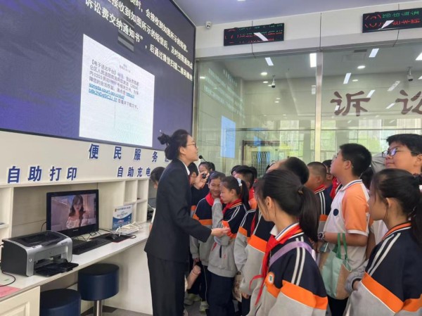 “安检仪和火车站里的一样耶!”“这个机器厉害,从网上就能立案!”“原来法官是这样判案的,真希望我以后也可以当法官!”沉浸式参观法院的学生们叽叽喳喳地说道。
