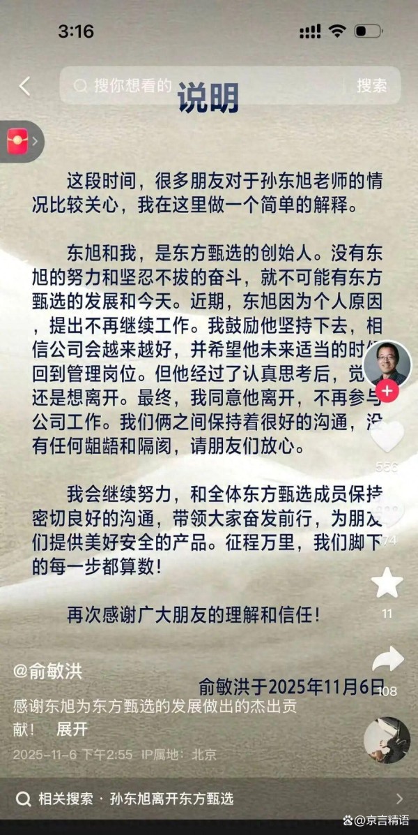 2025年11月6日下午四点,俞敏洪在抖音平台发布的一则声明,彻底终结了持续数月的猜测。这位新东方创始人用温和的措辞宣布:孙东旭正式离开东方甄选。