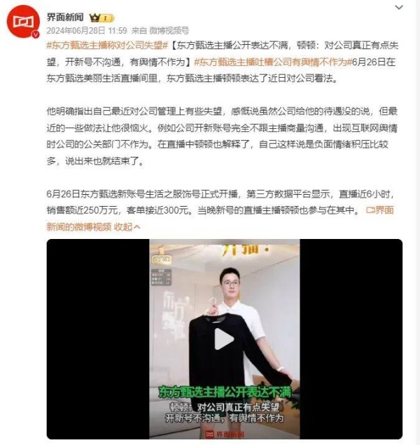 这些话语虽不激烈,却引发了极大讨论,“东方甄选主播称对公司失望”的话题一度冲上热搜,并引发东方甄选近30万粉丝流失。
