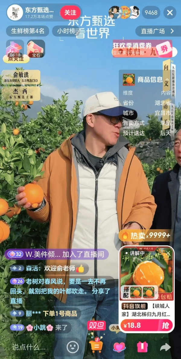 27日上午,俞敏洪走进秭归县九畹溪橙园,让果园变身直播间,现场品鉴新鲜脐橙,DIY柑橘饮品,风趣点评“五味杂陈(橙)”,直播间一时热闹非凡,让秭归脐橙成为“爆款明星”,短短两小时就售出十几万箱。