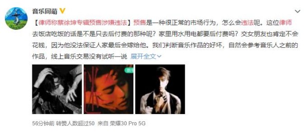 明明歌曲还没出来,但粉丝的钱已经被蔡徐坤收走了?这种类似“赊账”的发歌方式,不仅震碎了不少网友的三观认知,甚至还有数位音乐圈内的专业人士对于这种行为表示不解。问题来了,为什么会出现这种“贷款卖歌”的现象?“贷款卖歌”究竟是否违法?