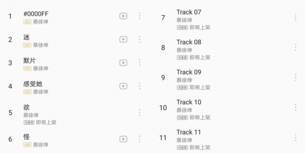 在网友提供的截图里,我们可以看到,蔡徐坤的这张专辑一共有十一首曲目。其中只有上半部分的五首歌曲可以收听,剩下一大半歌曲不仅全部显示着“即将上架”的备注,甚至连名字都没有。要知道此时距离该专辑上架已经过去了将近半年时间,这些歌曲不知道什么时候才能问世。