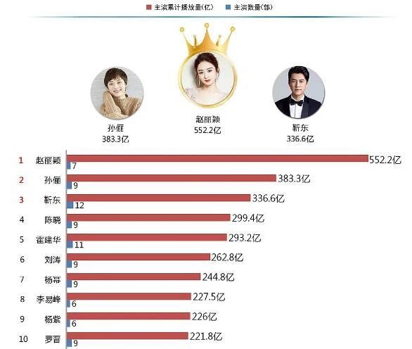 从图片中我们可以看出,赵丽颖以550多亿的播放量排在了第一位,而第二名是电视剧一姐孙俪,她的播放量是383亿,比起赵丽颖差了整整170亿,第三名是靳东,他的总播放量是330多亿,作品数量是12部,比起赵丽颖的7部和孙俪的9部要多不少。