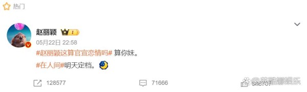 近期,赵丽颖于2025年5月22日通过个人V博,连发两条动态,回应近期与导演赵德胤的恋情传闻。她以“算你妹”直接回击热搜词条“赵丽颖这算官宣恋情吗”,并同步宣传主演新剧《在人间》定档信息,引发广泛讨论。