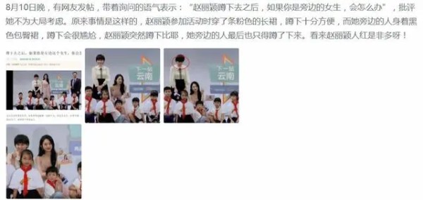 继“筷子事件”之后,近日有网友把赵丽颖做公益时的片段翻出,称:赵丽颖不顾身旁女生穿着短裙,拍照时自己穿着长裙就蹲下,导致身旁女生不得不蹲下配合赵丽颖,因为女生穿着短裙,所以蹲下去容易走光。