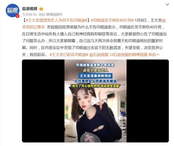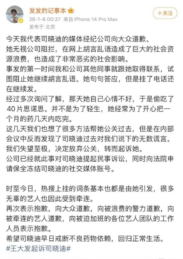 1月8日,网红经纪公司老板王大发的一纸诉状和一段视频,将旗下艺人司晓迪与“十余位顶流男星”的离奇绯闻推向了更戏剧化的高潮。面对司晓迪此前“炸翻”娱乐圈的连环爆料,王大发不仅代表公司公开道歉,更反手将自家艺人告上法庭,索赔200万并要求“没收”其所有社交账号。而针对外界最大的疑问——“为何被造谣的男明星们集体神隐不告?”王大发的解释更是惊人:因为司晓迪在发文前吞了40片安眠药,大家谁都“不敢惹”,怕出事。