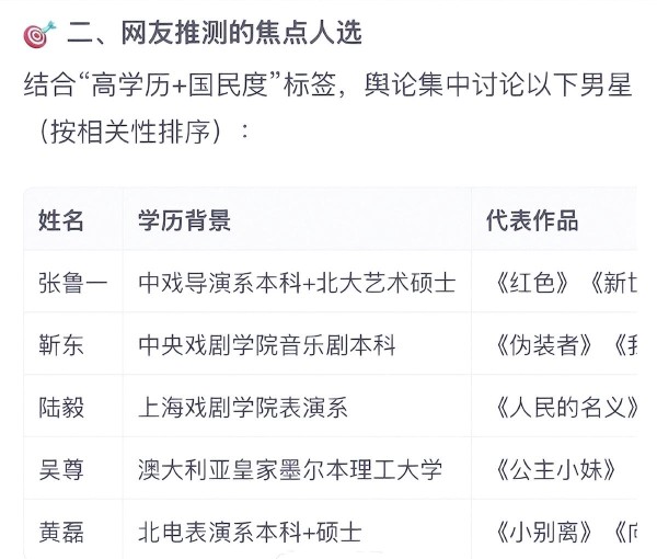 在未明确点名的情况下,卓伟的描述将现场氛围从单纯的信息披露转变为了一场猜谜游戏,同时也将潜在风险转移给了无辜的涉事者。这一举措迅速激起了网友们的广泛猜测,张鲁一、靳东、陆毅、吴尊和黄磊等名字被频繁提及。这些被猜测的对象,无一不是演艺圈内的佼佼者,各自拥有出色的学术背景和演艺成就。