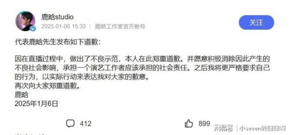 鹿晗发文道歉了!直播中做出不良示范,全平台账号被禁止关注